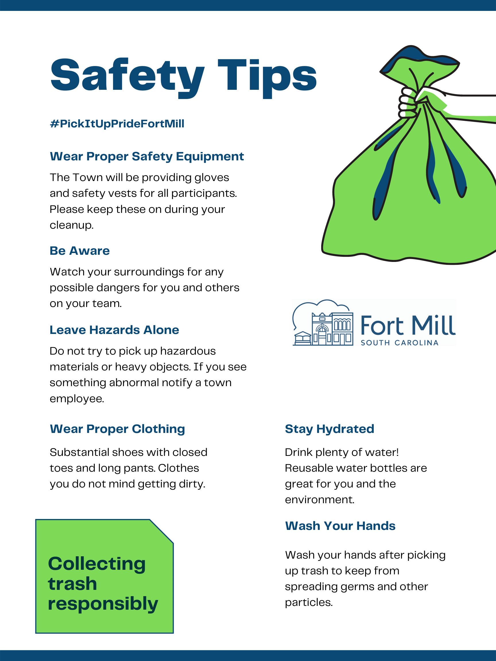 We encourage volunteers to share their collection successes by posting their photos with the hashtag #PickItUpPrideFortMill. See the bottom of the page for Litter Pick-Up Safety Tips, the Second Saturday Service Mission Statement and a Fort Mill Subdivision Map for identifying high-litter areas.