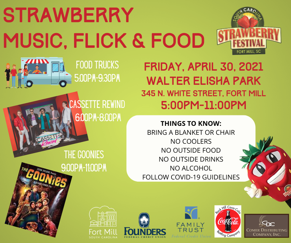 From our annual Strawberry Pageant and golf tournament, to new additions such as a 5K race hosted by the Fort Mill Economic Partners and our Music, Flick & Food event, the Town plans to offer the same fun, family-friendly atmosphere as previous years with a socially distanced twist. Though our traditional festival in Walter Y. Elisha Park will not take place this year due to the ongoing COVID-19 pandemic, the Town is committed to keeping the spirit of the festival alive through a variety of other events! See below: