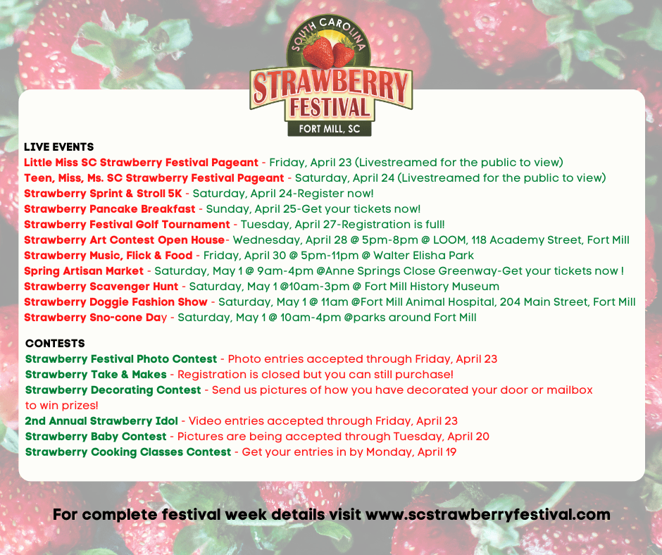 Keep an eye on the SC Strawberry Festival website (www.scstrawberryfestival.com) and social media accounts (Facebook- SCStrawberryFestival, Instagram- @scstrawberryfest, Twitter- @SCStrawberry) for updates on each of this year’s events. For more information, please contact Events Coordinator Jacona Hester at jhester@fortmillsc.gov or (803) 487-5413, or Public Relations Manager Chris Sardelli at (803) 992-0021 or by email at csardelli@fortmillsc.gov.